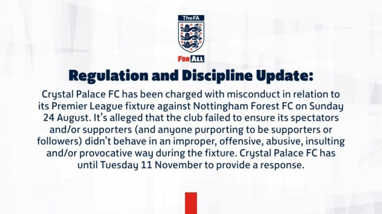 Nội dung thông báo: "Câu lạc bộ bóng đá Crystal Palace đã bị buộc tội có hành vi sai trái trong trận đấu ở Premier League với Câu lạc bộ bóng đá Nottingham Forest vào ngày 24 tháng 8, trong đó câu lạc bộ đã không đảm bảo rằng khán giả và/hoặc người ủng hộ (và bất kỳ người nào tự xưng là người ủng hộ hoặc người theo dõi) không hành động không phù hợp, hành vi xúc phạm, lăng mạ, sỉ nhục và/hoặc khiêu khích trong trận đấu."