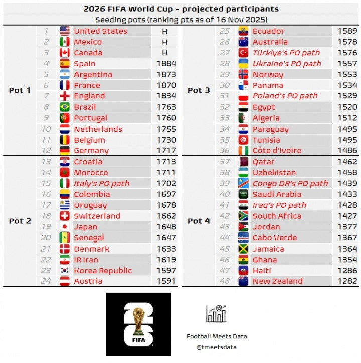 Ngày 17 tháng 11: Vòng sơ loại World Cup đang diễn ra sôi nổi. Hiện tại, 32 trong số 48 đội tham dự World Cup đã được xác nhận. Cơ quan dữ liệu Football MeetsData đã đưa ra dự đoán bảng đấu World Cup mới nhất.