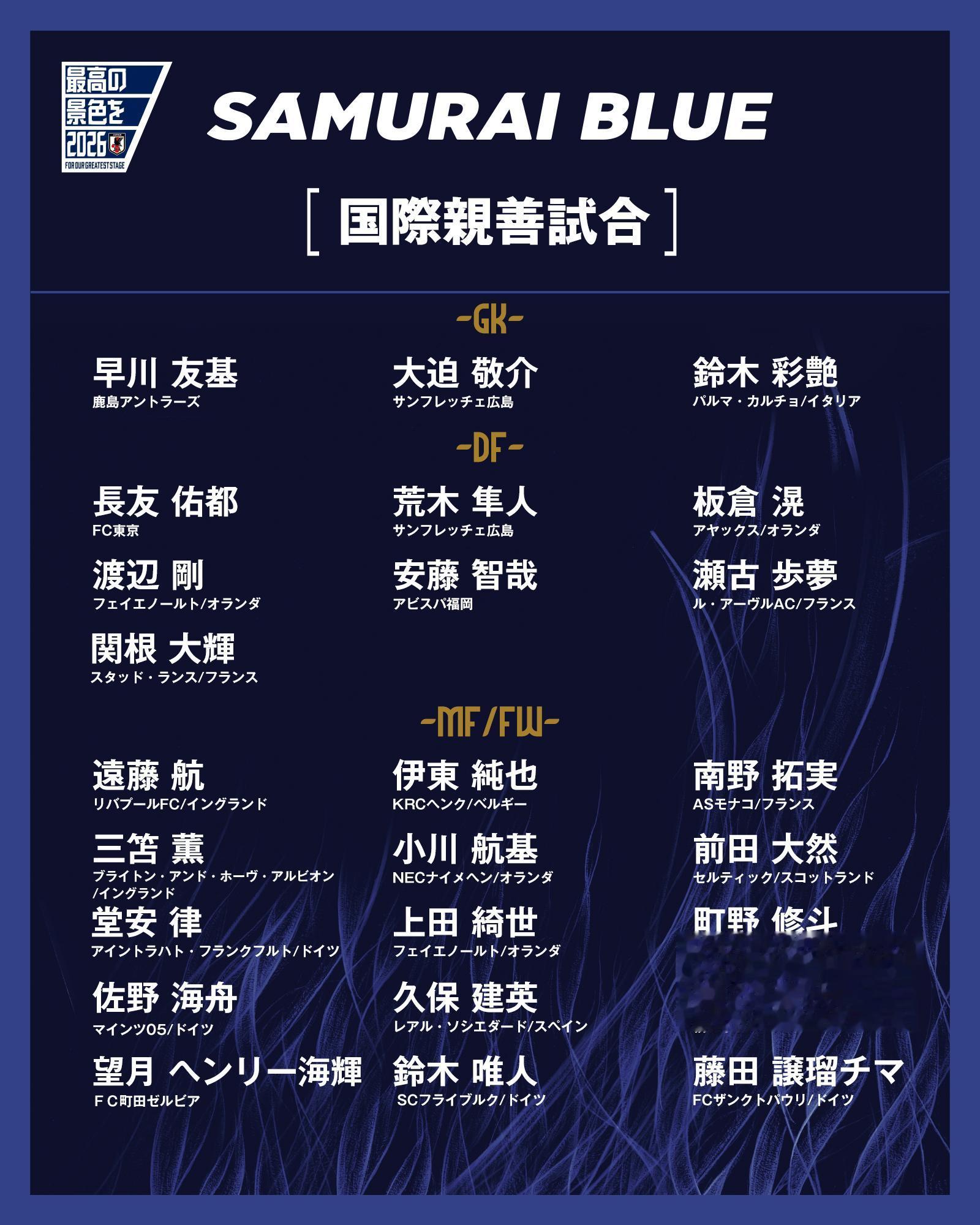 Thủ môn: Tomoki Hayakawa (Kashima Antlers), Keisuke Oma (Hiroshima ba mũi tên) Okura Ichiku (Ajax), Takashi Watanabe (Feyenoord), Tomoya Ando (Fukuoka Hornets), Sekoto (Le Havre), Daiki Stanen (Lens) Mirassa (Brighton), Ogawa Yokiki (Nimegen), Maeda Daran (Celtic), DOA Ari (Frankfurt), Kise Ueda (Feyenoord), Shuto Machino (Monchengladbach) Hoshitsuki-Henry-Haiki (Machida Zevia), Suzuki Weiren (Freiburg), Fujita-Jeru-Kimma (Sao Pauli)