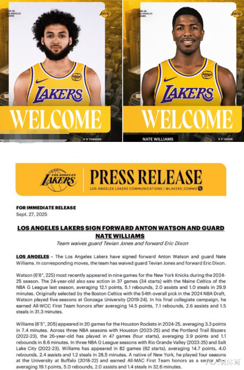 Vào ngày 28 tháng 9, Lakers chính thức phát hành một tin tức điều chỉnh đội hình, và nhóm đã ký hợp đồng về phía trước Anton Watson và hậu vệ Nate Williams, trong khi cắt bỏ TVian Jones và tiền đạo Eric Dickson. Động thái này chắc chắn bổ sung các biến và kỳ vọng mới cho đội hình của Lakers trong mùa giải mới. Chúng ta hãy xem xét kỹ hơn hai người chơi mới.